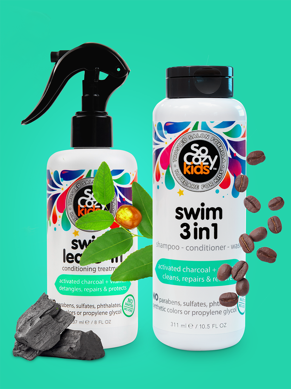 Step one: Clarify and conditioner hair with SWIM shampoo. SWIM shampoo uses activated charcoal to clarify swimmer’s hair to remove chlorine and salt. SWIM shampoo also has a conditioner to help to moisturize dry and damages hair.
